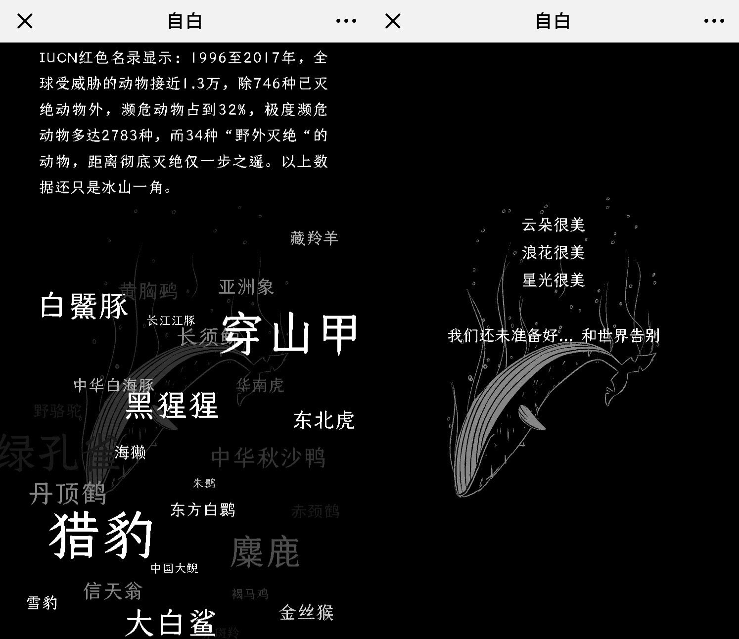 ??意外是指制造驚喜來吸注意力,或者用懸疑色彩來裝點內容引發好奇心和興趣。比如保護瀕臨滅絕動物的H5《自白》,開頭的黑白漫畫表現的像是一起校園霸凌事件,主角在劇情中進行了角色變換,由女孩變為藍鯨,隱喻人類傷害動物,就是傷害人類自己。